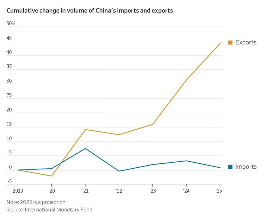 The latest data indicate China’s accumulated trade surplus (exports minus imports) has kept growing, reaching a new peak of $1.08 trillion by the end of November—higher than the annual total for 2024, and up over 21% year on year, as the New York Times reports. “Strip out imports of energy, food and raw materials, and China is on track this year to post a surplus in manufactured goods of around $2 trillion,” the Wall Street Journal notes. That’s equivalent to the GDP of Russia, and twice the level in 2020.
