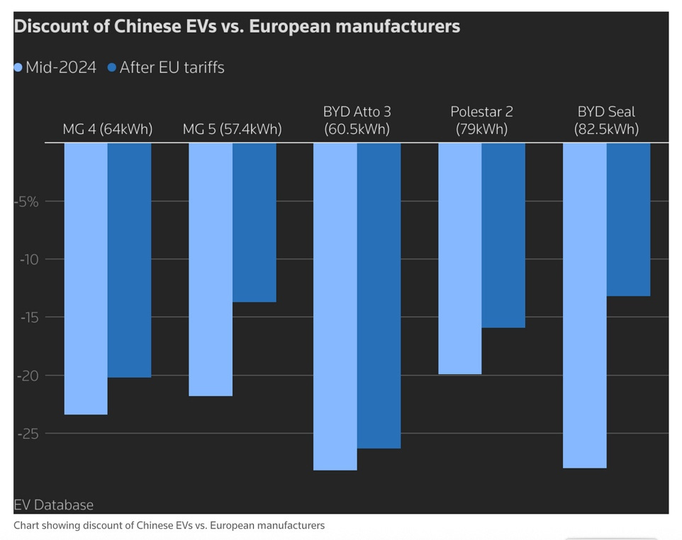 Automotive expert Michael Dunne reports that Chinese electric vehicle manufacturing is marching into Europe and gutting Western automakers. The EU has imposed various tariffs on Chinese EVs. That’ll be enough, right? Wrong. Look at the bar chart below. They’re not high enough to level the playing field. Moreover, they do nothing to stop European firms’ loss of export markets to Chinese competitors.