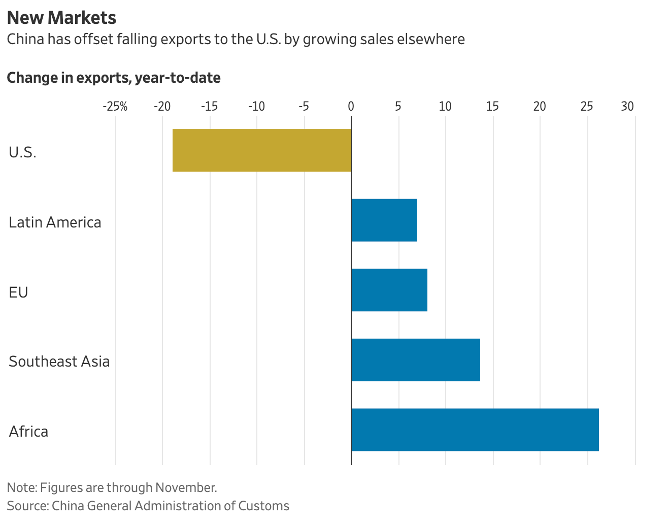 Donald Trump’s extraordinary tariff hikes this year are not only raising prices in the United States, they’re also constricting America’s role as global consumer of last resort. It’s buying less from China. Check out this Times interactive to see who’s absorbing the surplus. Short answer: everyone else, as the bar chart below shows.