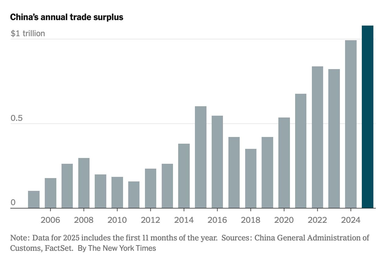 Source: “China’s Trade Surplus Climbs Past $1 Trillion for First Time”, New York Times